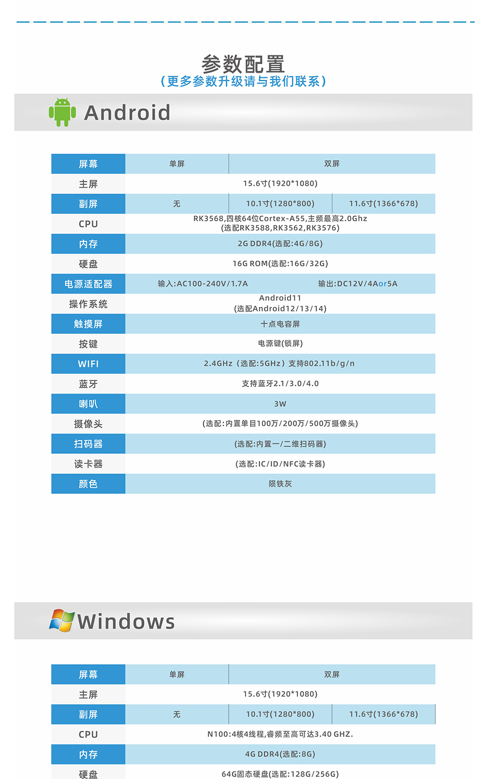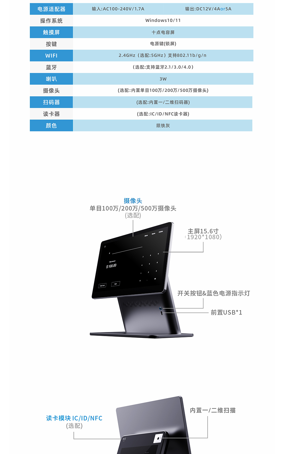 15.6寸单屏1920*1080 RK3568:4核64位Cortex-A55主频最高2.0GHz 2G内存+16G储存 内置二维扫码盒子&NFC 十点电容触摸屏 安卓智能触摸收银机